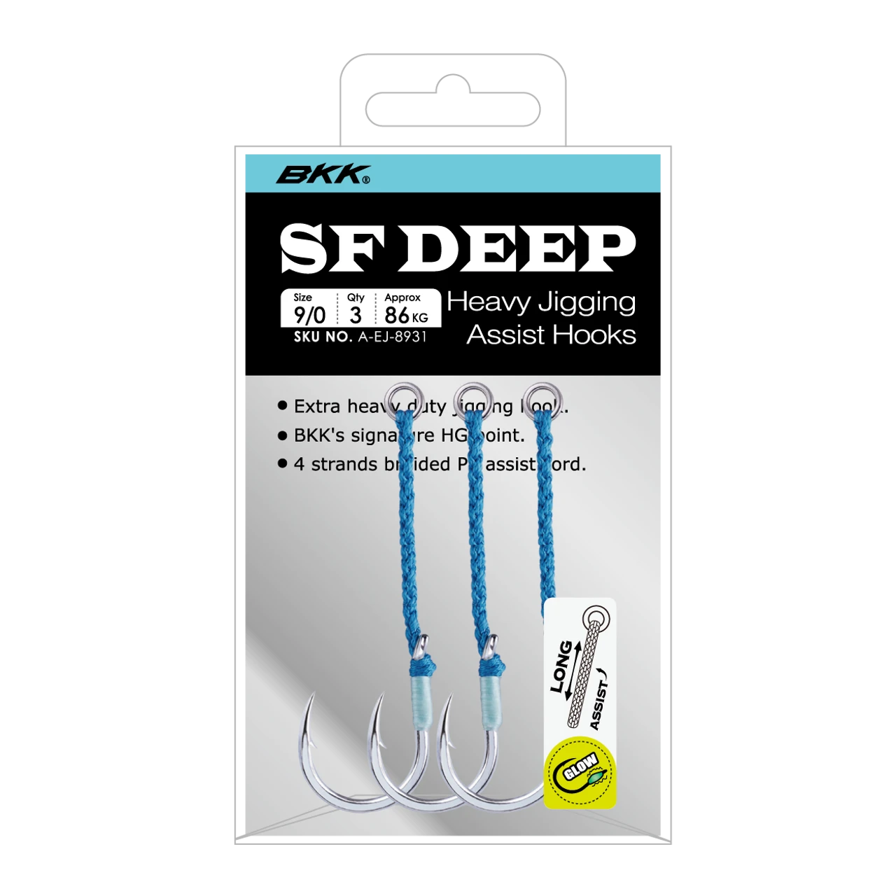 The BKK SF DEEP-HG LONG is the long assist version of BKK’s meanest jigging assist, the SF DEEP-HG. It maintains all the features of the shorter model: razor-sharp Hand Ground point for improved penetration, a perfectly welded ring and forged bend for enhanced strength, slim shanks for weight reduction, tin coating for excellent saltwater corrosion resistance, and 4-strands braided PE assist cord for long-lasting performance. The addition of the longer assist cord makes it the perfect match for longer knife jigs when fish bite short.