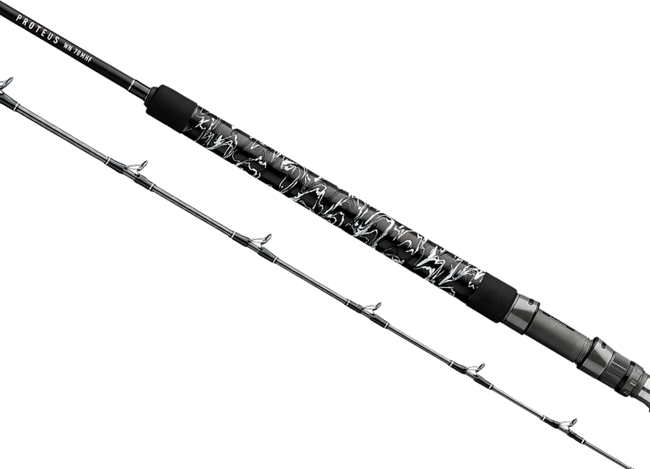 Daiwa is pleased to announce a partnership with Winn Corporation in creating a new beautifully appointed series of saltwater rods, the Proteus Winn Boat Rods. The Daiwa exclusive new Winn Grip Wrap is both attractive and functional providing a sure grip that is firm and rugged. The HVF Carbon Technology constructed blank is lighter and stronger than conventional materials, well suited for the demands of active, coastal fishing. X-45 Carbon Bias Technology resists twisting and distortion as the blank loads up, maintaining a bend accuracy whether casting or pulling on a fish. Fuji® FazLite Tangle Free K-Guides cast long and straight and refuse to hang-up while leaving a small footprint on the blank. The innovative Fuji Back Stop Lock Nut System firmly attaches the reel and never backs off. Available with a black rubber butt cap or a gimble rubber butt cap depending on the angler’s needs. With 16 models to choose from in both spinning and casting designs, this series has a rod that is right for you. The series matches well with Daiwa’s exclusive new Lexa Winn reels. The superior quality components and construction is backed up by a Limited Lifetime Warranty. If you are looking for boat rods designed for the techniques and rigors of inshore and offshore fishing on both coasts, look no further than the smashingly attractive Proteus Winn Boat Rods, great looks equaled by great performances.