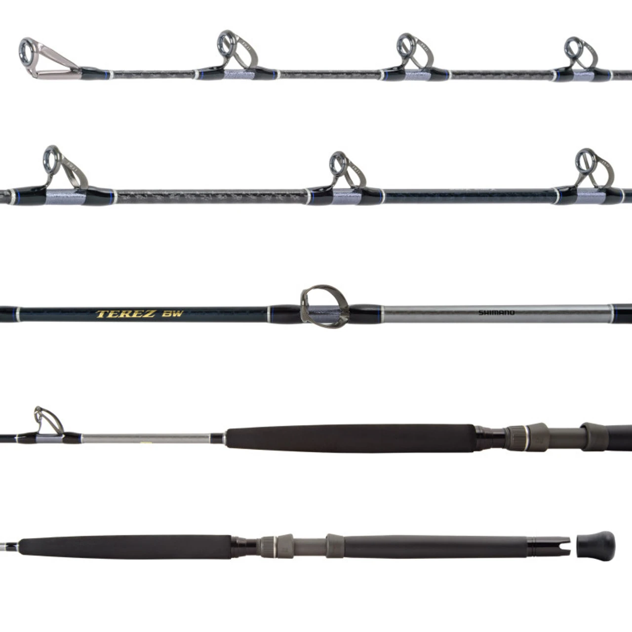 Designed to provide the ultimate advantage over the toughest offshore game fish, the Shimano Terez BW Slick Butt Conventional Rods specialize in versatility and unwavering reliability. Built on Shimano’s most advanced blanks to date, the Terez BW rods benefit from three proprietary Shimano blank technologies — Hi-Power X, Spiral X, and UD Glass construction. Spiral X construction consists of multiple layers of carbon tape that tightly wind the blank diagonally in opposite directions, resulting in enhanced torsional rigidity without adding extra weight. UD Glass greatly enhances rod strength while retaining the ability to flex. This combination of rod technologies increases the structural rigidity of the rods so that they remain true under load while enabling anglers to efficiently transfer power through the blank for much needed fighting power in heavy offshore applications. Outfitted with only the highest quality components, the Terez BW Slick Butt rods feature highly durable Fuji SiC guides and Fuji DPS-H reel seats. The slick butt handle configuration allows for easy insertion and removal from rod holders at a moment’s notice. Anglers will find this series to be the ideal workhorse offshore rods for techniques like bottom fishing, live-bait fishing, and even sight casting artificials.